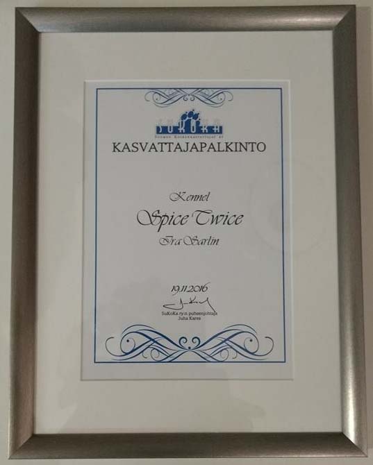 Kennel Spice Twice was awarded in 2016 with Sukoka's (The
